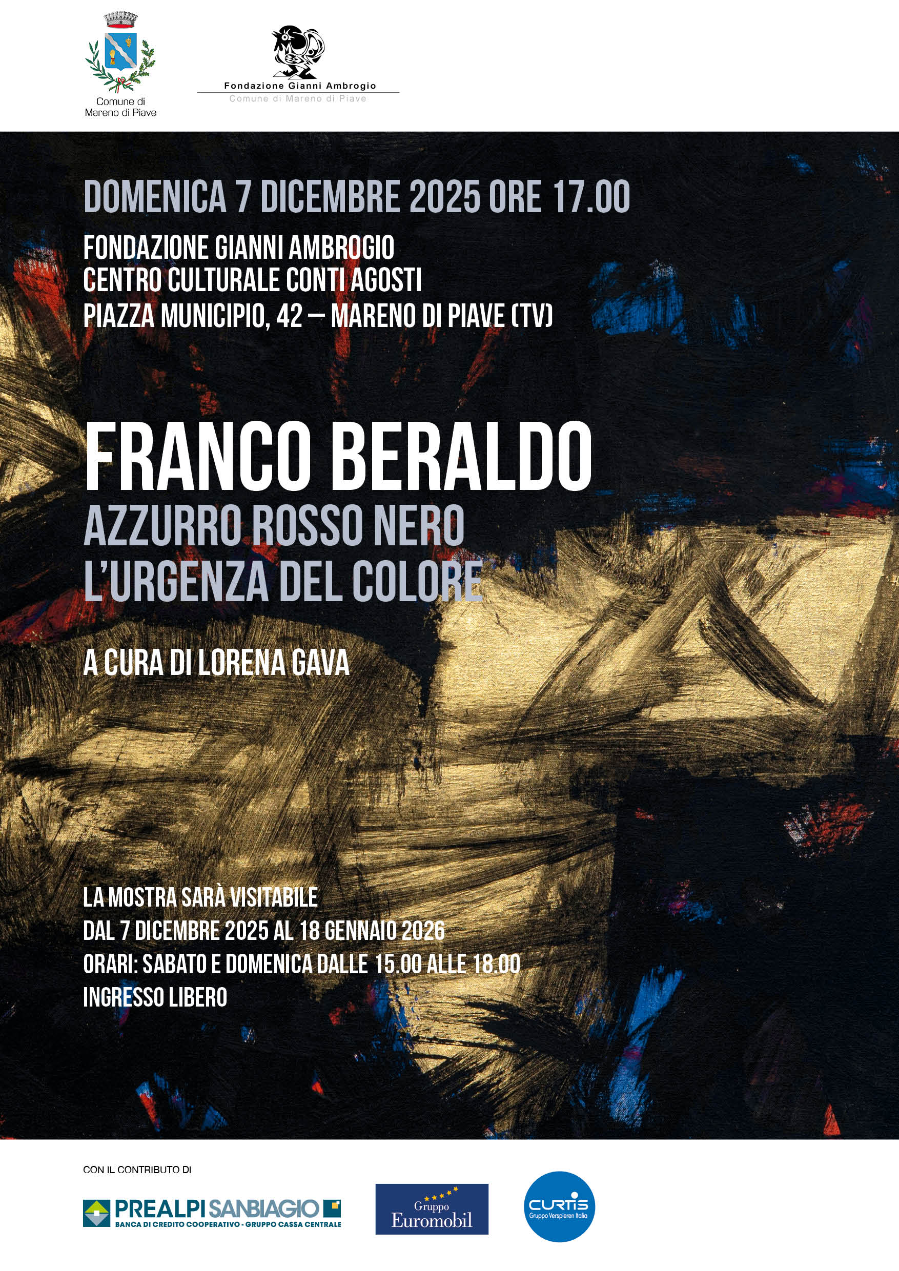 Domenica 7 DICEMBRE 2025 alle ore 17:00, presso il Centro Culturale Conti Agosti di Mareno di Piave, Fondazione Ambrogio ed il Comune di Mareno di Piave avranno il piacere di inaugurare la personale dedicata all'artista mestrino Franco Beraldo.